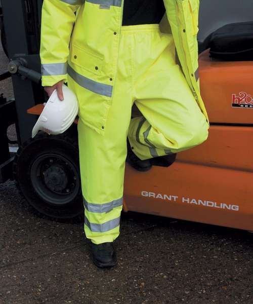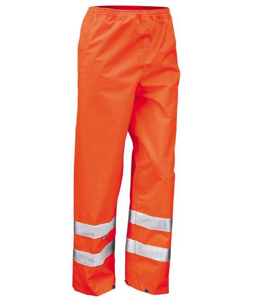 Waterproof 3000mm, windproof. Taped seams, no outside leg seam. 2 side access pockets and 1 back key pocket. Elasticated waist with drawcord adjuster. Stud closing ankle adjusters. 50mm reflective leg bands. Cutaway label. EN ISO 20471 + A1:2016 CLASS 1. RIS-3279-TOM ISSUE 2:2019 CLASS 1 (orange only*). *Orange only meets RIS 3279 Tom: Issue 2:2019 when worn with unobscured class 2 upper body clothing. Note: These garments should be worn fastened and kept clean to maintain effectiveness. Oeko-Tex certified. Decorating methods: Embroidery, transfer and print.