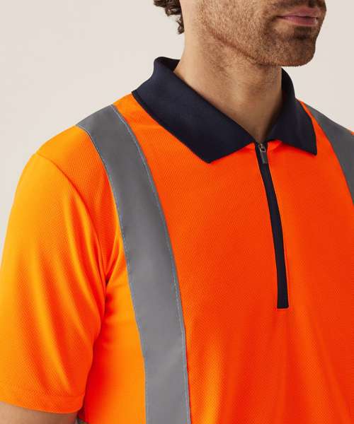 100% quick-dry polyester piqué fabric. Conforms to EN20471: 2013 +A1: 2016 Class 2 (orange also RIS-3279-TOM). Natural wicking fabric. Ribbed collar with zip neck.