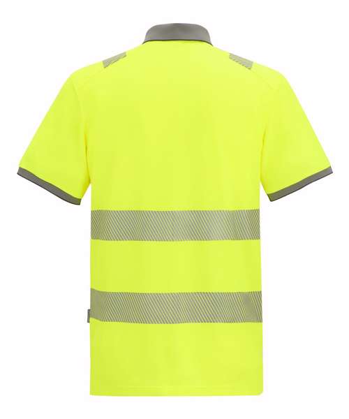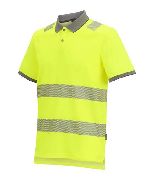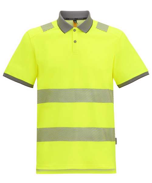 Polycotton piqué fabric with cotton on the inner side for enhanced comfort against the skin. Lightweight and breathable. Certified to EN ISO 20471:2013 A1:2016 Class 2. Orange colourway also certified to RIS-3279-TOM. Fabric provides UPF 40 protection. Heat-applied segmented tape for additional comfort. Contrast tipping to ribbed collar and cuff. Two-button placket. Side vent detail. Contains recycled polyester.