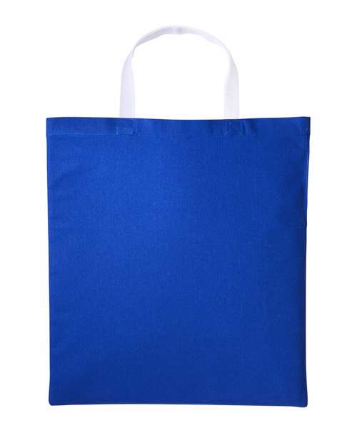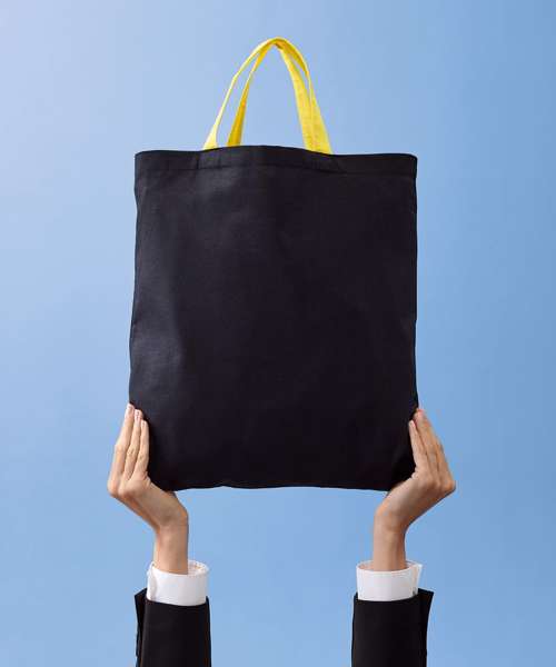 Two-tone cotton shopper. Short handles, 35 x 2.5cm. Inside hemmed sewing. Cross-stitches at handle. Perfect print surface.