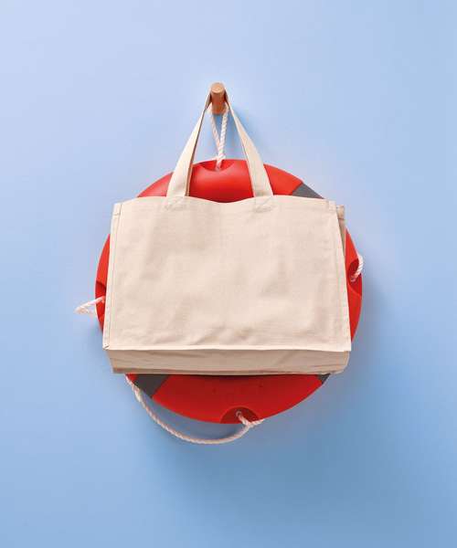 Stand-up shopper made from recycled cotton canvas. 220gsm, with a polyurethane coating that enables it to stand up. Soft webbing handles.