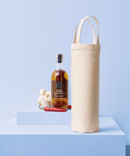 Premium bottle bag. 100% recycled cotton canvas. 220gsm. Short handles. Handle measurements: 2 x 22.5cm. One size. Holds bottles of up to 1.5 litres in capacity.