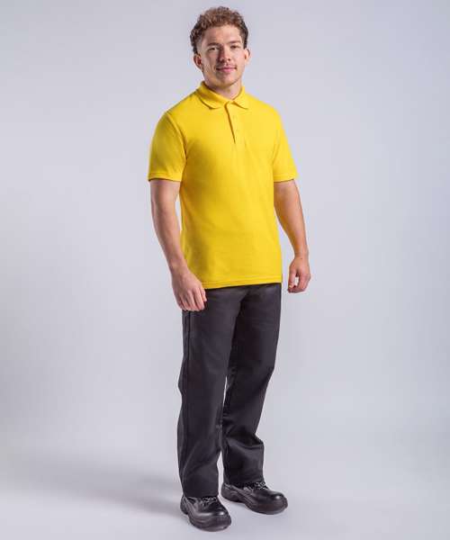 The Pro polo comes in a wide range of sizes to cater for work teams of all sizes, therefore is ideal for uniforms. It features a ribbed self collar, self taped neck, twin-needle stitching for durability and 3 self-coloured button placket, as well as a comfortable modern fit.
