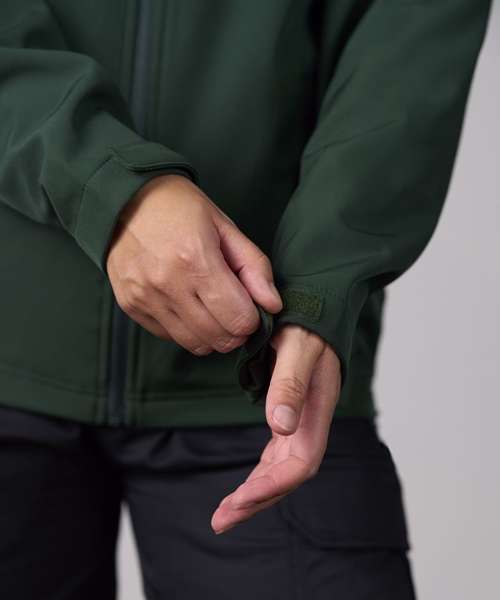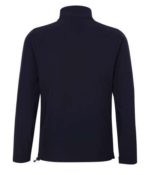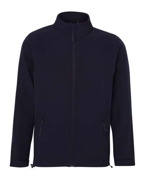 Two layer bonded softshell jacket with full zip front fastening. Relaxed fit. Two front zipped side pockets. Chin guard with internal storm flap. Adjustable shockcord hem.