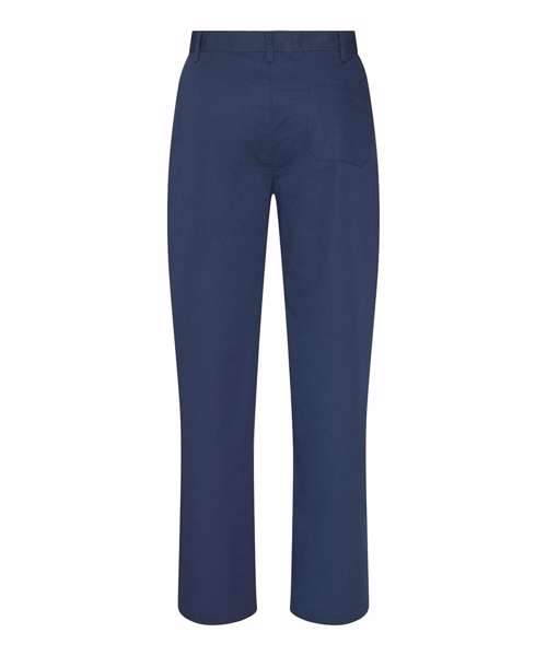 Clean, modern workwear trouser with two front pockets, one patch pocket at seat and waistband with belt loops. Made from a durable poly/cotton blend fabric.