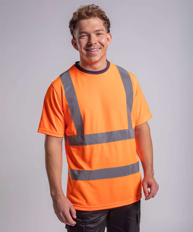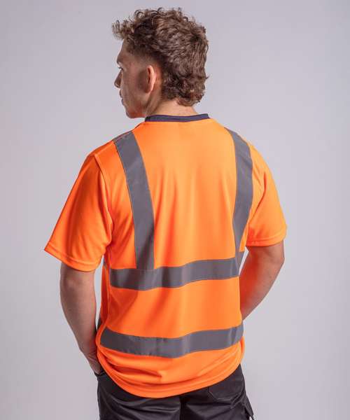 The high visibility t-shirt is a workplace essential, crafted from lightweight, breathable Birdseye polyester, the reflective tape finished short of the side seam for a flexible and comfortable fit. The contrast collar creates both a functional yet stylish garment.