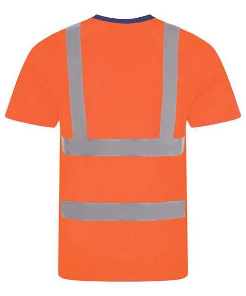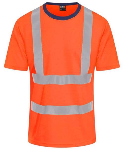 Certified EN ISO 20471:2013+A1:2016. RIS-3279-TOM ISSUE 1:2016 (Orange only). HV Orange/Navy & HV Yellow/Navy - Class 2. Ribbed contrast colour collar. Twin-needle stitching on shoulder. Twin-needle stitching on sleeve and bottom hem. Over shoulder and around body reflective tapes. Around body tape finishes before the side seam for comfort and ease of fit.