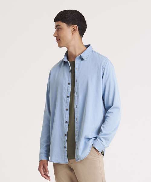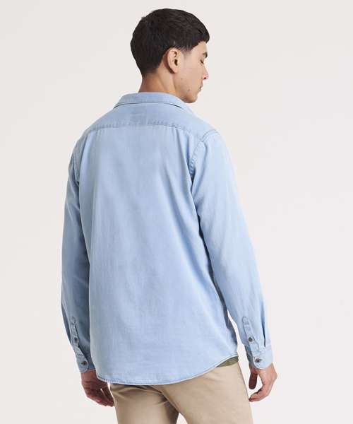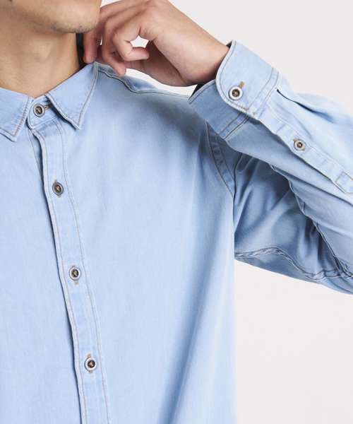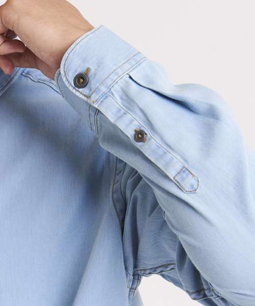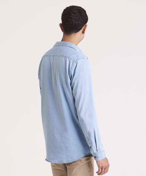 Classic long sleeve light weight denim shirt. Features include front button placket, button detail at cuffs and back yoke. Satin weave. Turned hem with single needle stitch detail. Fashion fit. Single needle contrast at armholes collar and front placket. 2 button placket at cuff. Button placket centre front fastening. Modern narrow collar. Yoke at back shoulder. No pockets for maximum embellishment area.