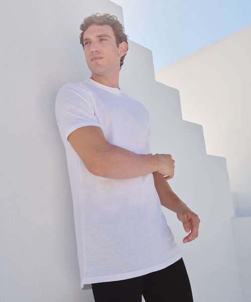 The extra long-length and regular fit at chest and shoulders provides great creative opportunities for a cool logo, motif or fashion slogan. With urban-feel drop tail hem and stretch ribbed crew neck finish. Tear-out label for easy rebranding.