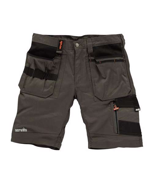 Hard-wearing work shorts designed for lasting comfort. Regular fit for classic look. Lightweight twill fabric with heavy-duty canvas pocket reinforcements and triple-stitched seams for durability. Features cargo pocket, rule pocket, mobile phone socket and secure zipped pocket. Hammer loop, tool loops and D-ring for transporting tools and accessories while on the job. YKK zipped fly. Certified Sedex.