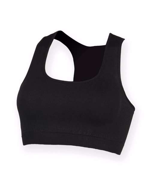 Mix-up your workout with this racer-back cropped top. Features a seamless knit with light support and shaping. Tear-out label for easy rebranding.