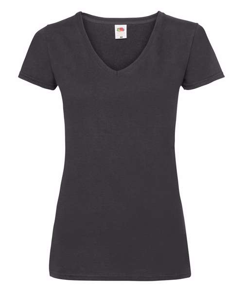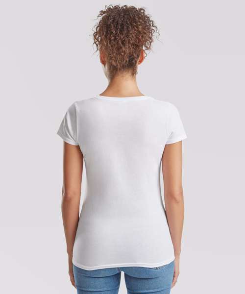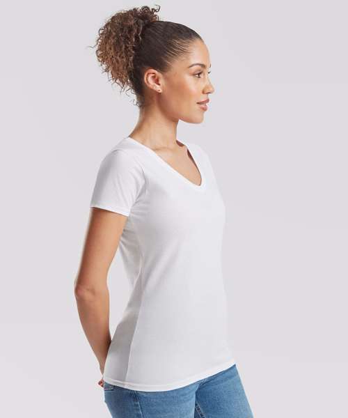 With a fine knit gauge for enhanced printability, the women's Valueweight v-neck T is ideal for all kinds of garment decoration, offering shaped side seams for a feminine fit, a v-neck with cotton/Lycra® rib and self-fabric back neck tape for comfort. Fruit’s women's Valueweight v-neck T is available in a great range of colours.