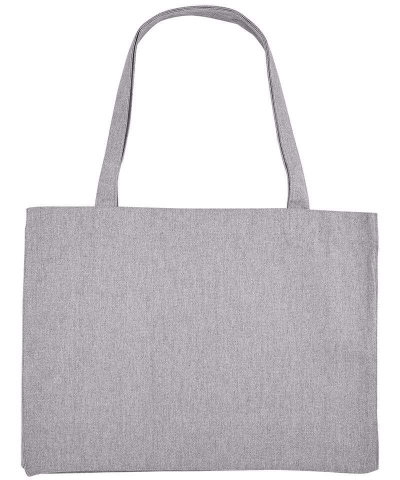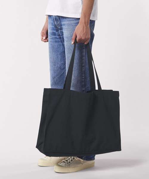 The woven shopping bag is cut in premium 300gsm 80% reclaimed cotton, 20% recycled polyester and features clean and reinforcing finishes.