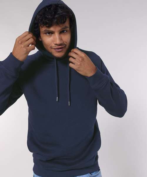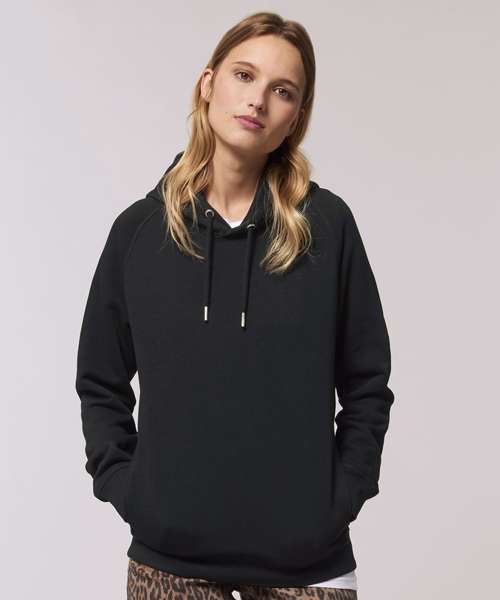 The raglan unisex hoodie sweatshirt in premium brushed 300gsm fleece, 85% organic cotton, and 15% recycled polyester. Featuring a double self-fabric hood lining which offers sturdy and durable wear, plus matt silver metal eyelets, and drawcord tipping. There is flatlock top-stitching, side pocket offering a bigger space for decoration and a half-moon at back neck.