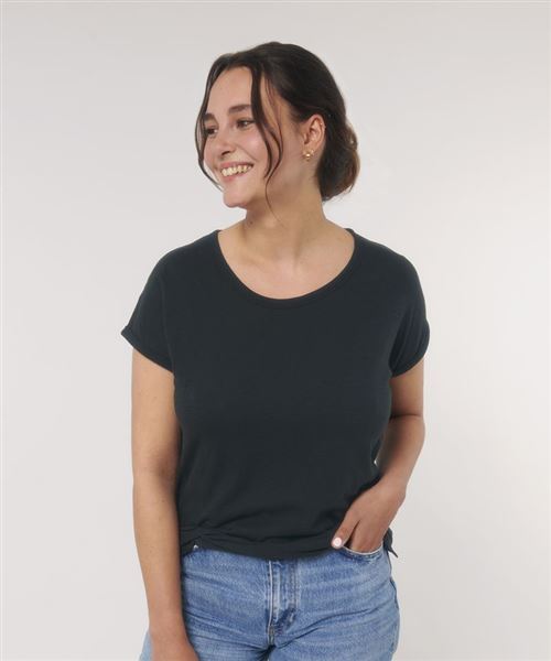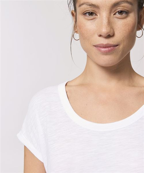 The women's dolman sleeve t-shirt is crafted from premium 130gsm 100% organic cotton slub single Jersey, and is truly feminine with its rolled up sleeves and slit at side seams.