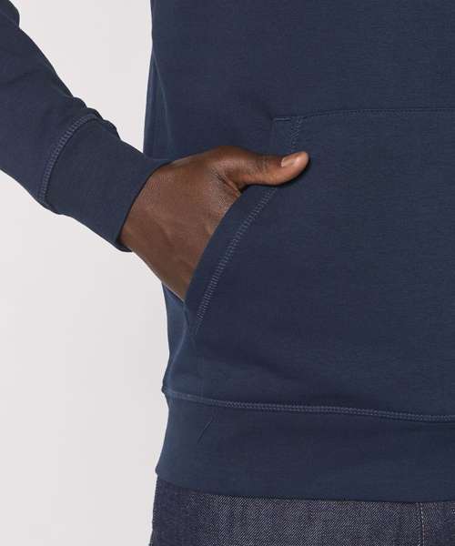 Set-in sleeve. Lined hood in single Jersey. Round drawcords in matching body colour. Stitched buttonhole eyelets. Inside herringbone back neck tape. Self-fabric half moon at back neck. 1x1 rib at sleeve hem and bottom hem. Flatlock topstitch on all seams. Kangaroo pocket with flatlock topstitch.