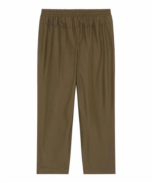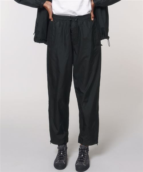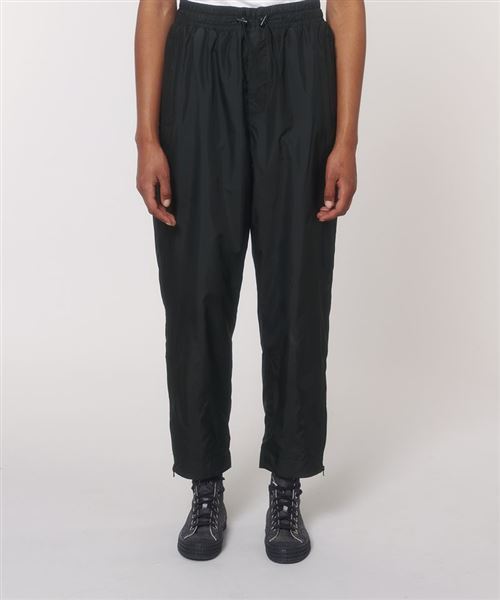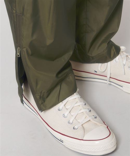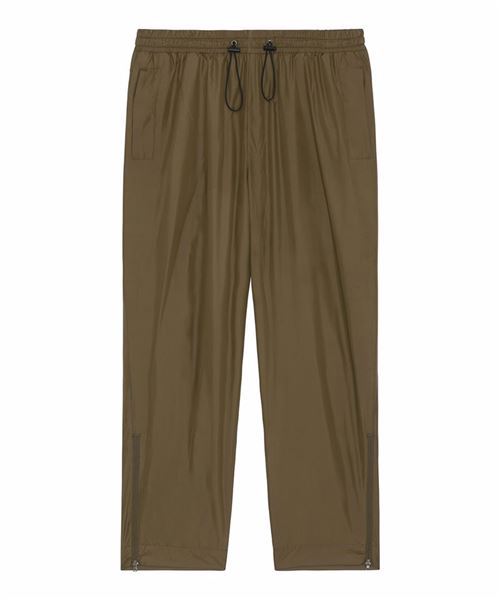 Elastic waistband with adjustable plastic stopper and elastic string. Welt side pockets with reverse zip and extra grosgrain pull. Zip at leg opening.