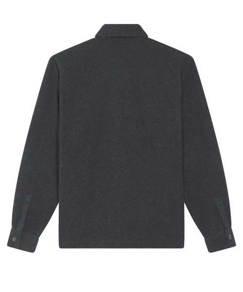 Unisex, unlined shirt jacket. Set-in sleeve. Self-fabric collar with collar stand. Button-down front placket with one button on sleeve cuff. Chest pockets and side seam pockets on both sides. Inside hanger loop in grosgrain tape. Spare buttons attached on inside seam.