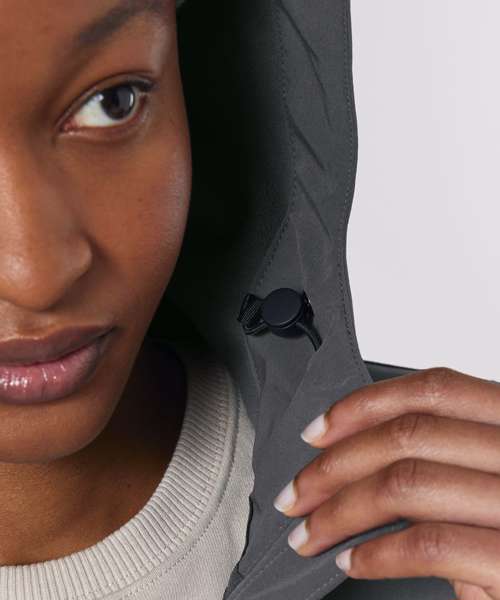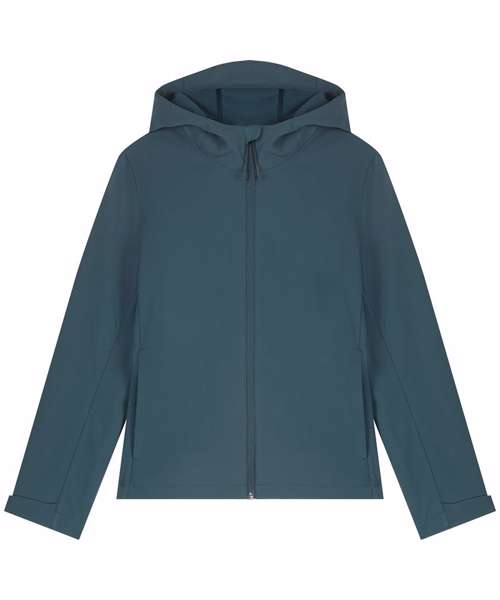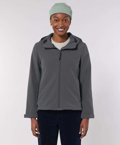 Women’s hooded softshell jacket, medium fit with set-in sleeve, high collar and panelled hood. Hood opening and bottom hem with adjustable plastic stopper and elastic cord. Reverse nylon zip at centre front. Zipped welt pockets with reflective elastic puller. Bonded three-layer fabric with internal membrane. Fully bonded fleece inside layer. Side panels and stretch for better shape. Adjustable hook and loop sleeve opening. Inside seams finished with recycled binding. Water-repellent up to 10,000mm, breathability up to 3000G/M2/24hrs allowing perspiration to escape. Windproof. Bionic ECO DWR (durable, water-repellent) finish.