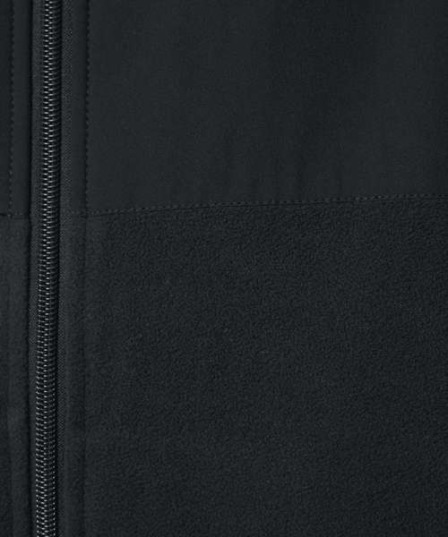 Set-in sleeves. Elastic binding at cuffs and hem. Inside back neck binding loop and back neck tape. Nylon coil zip with metal zip pull and cord ending. Brushed polar fleece fabric with anti-pilling finish on the inside and outside. Front side welt pockets with hidden zip closure. Contrast softshell fabric at the yoke and outer collar. Inside invisible zip at the wearer’s left chest for easy decoration.