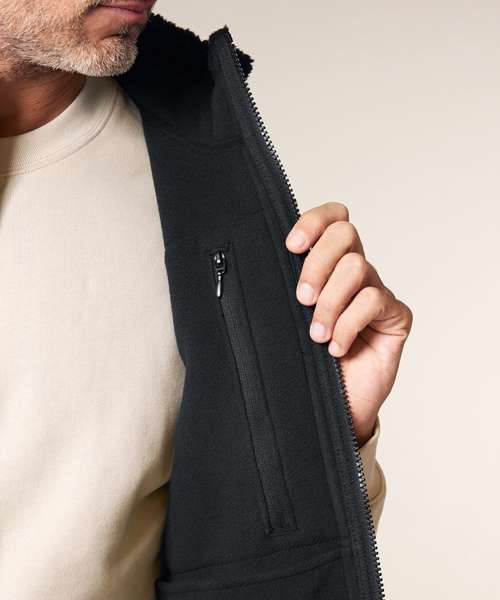 Sleeveless. Elastic recycled binding at cuffs and hem. Inside back neck binding loop and back neck tape. Plastic Vislon zip with metal zip pull and cord ends. Fully bonded inside polar fleece layer with anti-pilling finish. Front side contrast softshell welt pockets with hidden zip closure. Contrast softshell fabric at pocket, back yoke and outer collar band. Inside invisible zip at the wearer’s left chest for easy decoration.