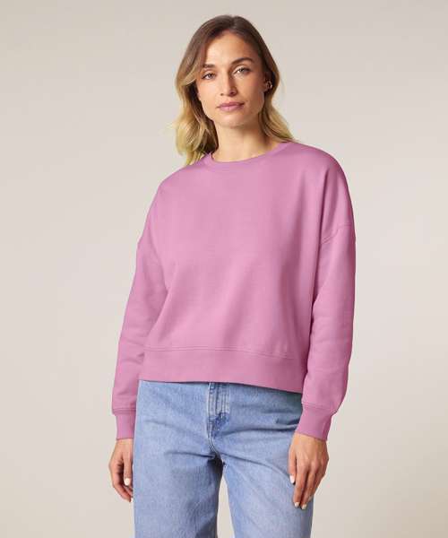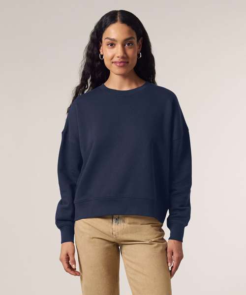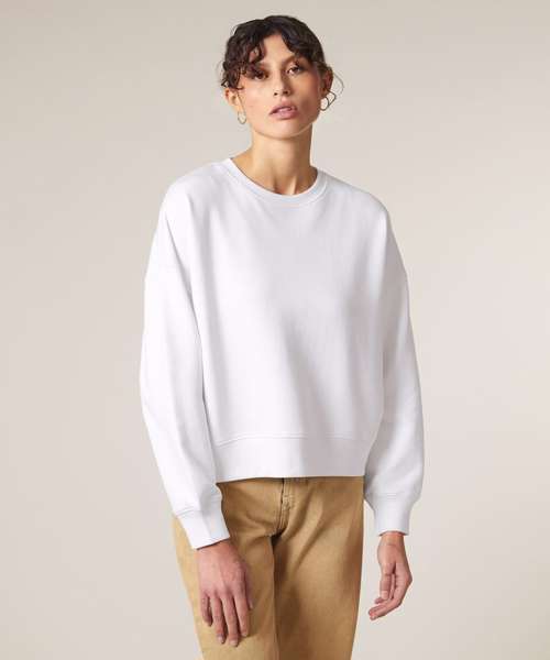 Premium women’s crew neck sweatshirt in brushed 100% organic cotton, 300gsm. Dropped shoulders, adjusted length. Broad colour choice. Excellent printability.