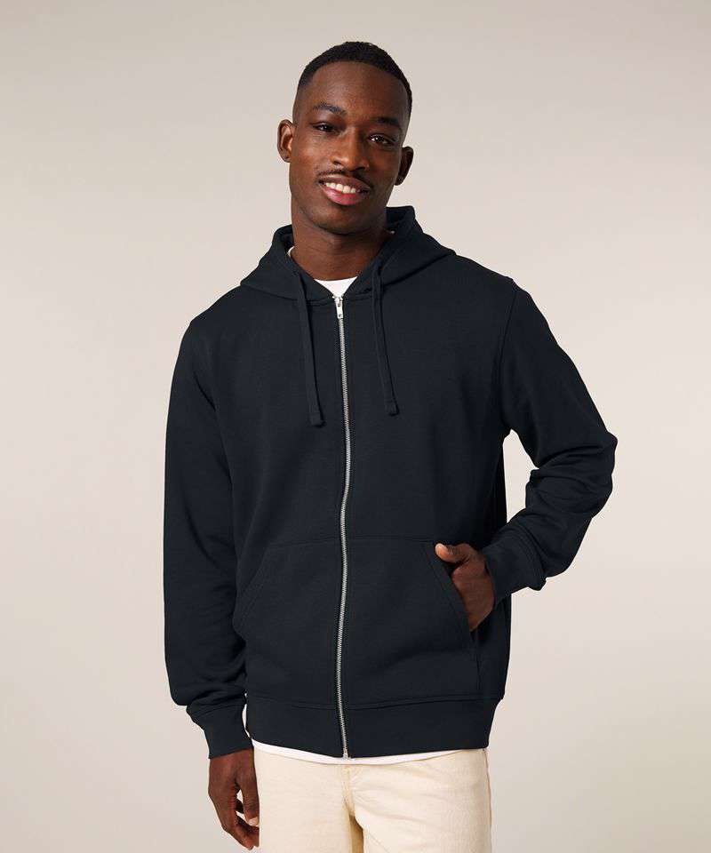 Premium, unisex, mid-light, zip-through hoodie sweatshirt in 280gsm brushed 85% organic cotton and 15% recycled polyester. Medium fit. Excellent printability.