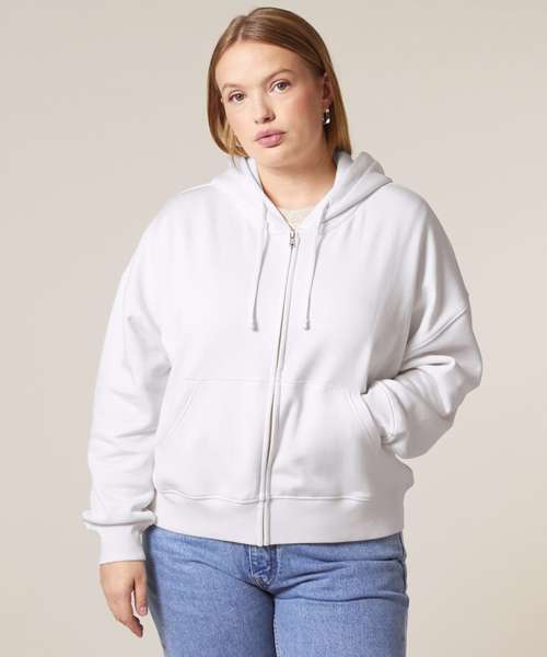 Premium women’s zip-through hoodie sweatshirt in brushed 100% organic cotton, 300gsm. Dropped shoulders, adjusted length. Excellent printability.