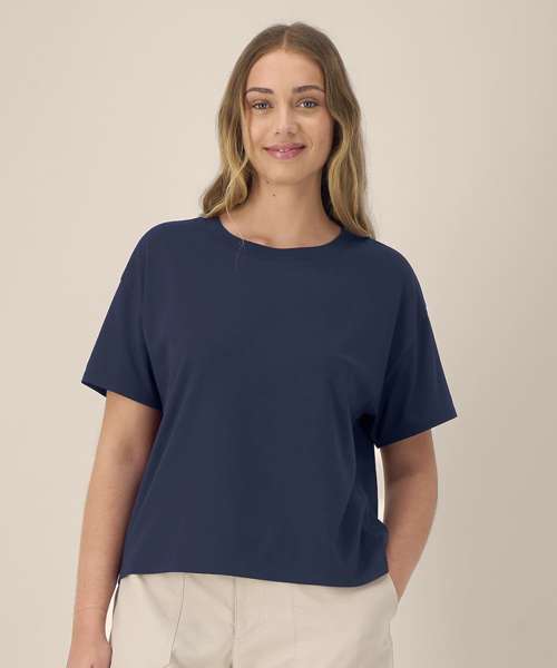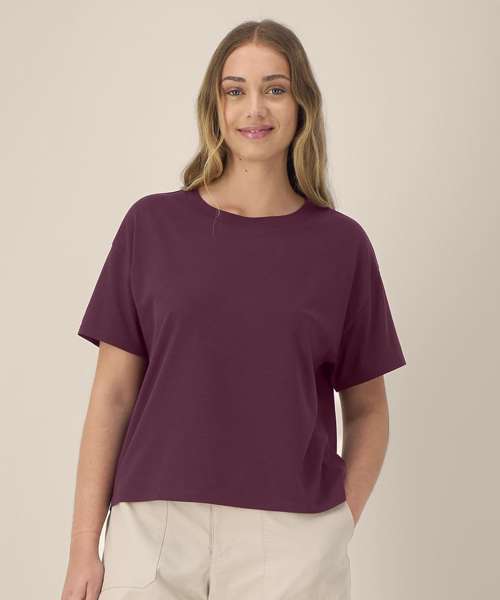 Women’s cotton modal t-shirt. Set-in sleeves. Longer back with curved hem. 1x1 rib at collar. Self-fabric back neck tape. Twin-needle topstitching at sleeve cuffs and hem. Contains 60% OCS-certified organic cotton, certified by Control Union CB-CUC-1393082. Contains 40% Modal (TENCEL™).