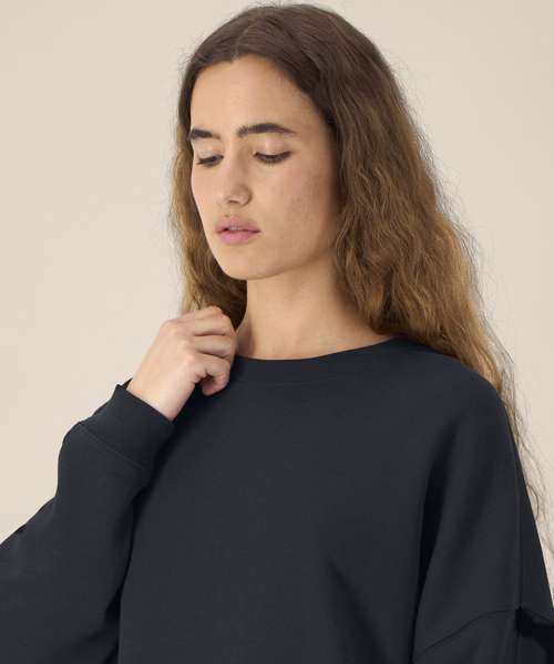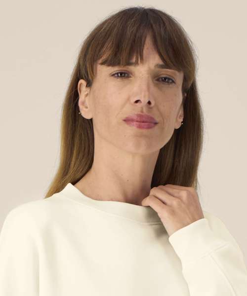 The Stella Lianna is a women’s crew neck sweatshirt crafted from a smooth organic cotton-TENCEL™ modal blend. It offers a soft hand feel, breathable comfort and a relaxed fit for extra comfort. With its natural fluidity and feminine shape, it drapes effortlessly while maintaining structure through twin-needle topstitching and forwarded side seams. The 1x1 rib at the collar, cuffs and hem adds subtle texture, while the herringbone back neck tape and self-fabric half moon complete the clean interior finish. Lightweight yet cosy, this trendy cotton modal sweatshirt is ideal for custom decoration and perfect for collections that value softness, fluidity and premium printability.