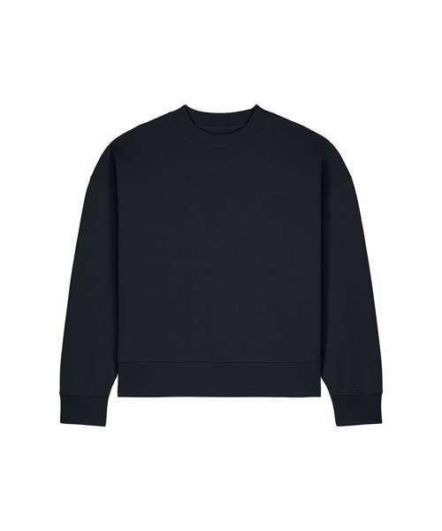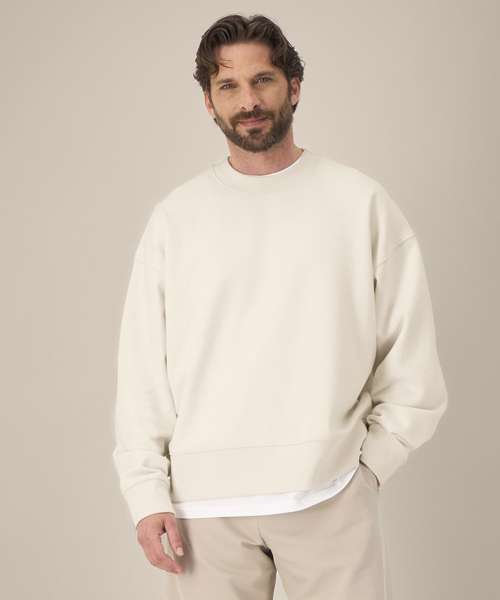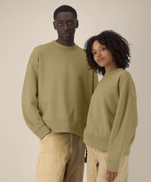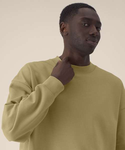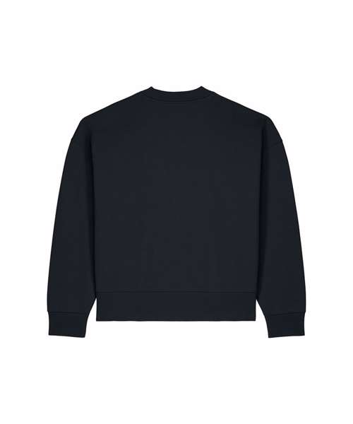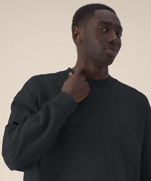 Unisex recycled cotton boxy crew neck sweatshirt. Set-in sleeves. 1x1 rib at sleeve cuffs and hem. Twin-needle topstitching centred on seams at shoulders, armholes, sleeve cuffs and hem. Inside herringbone back neck tape. Self-fabric half-moon at the back neck. Contains 50% GRS-certified recycled cotton and 50% OCS-certified organic cotton, certified by Control Union CB-CUC-1393082.