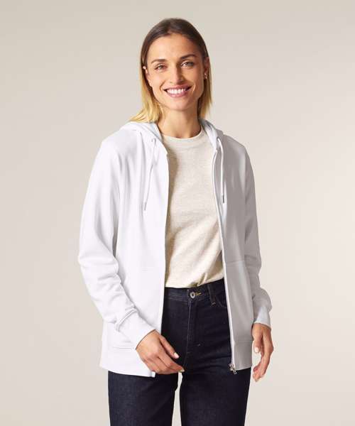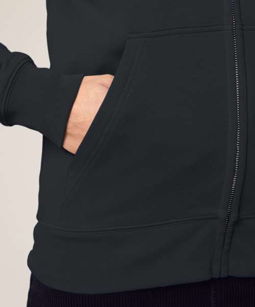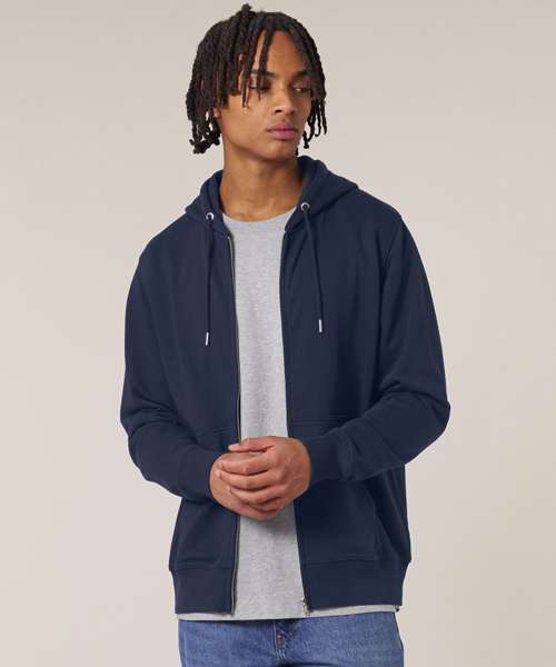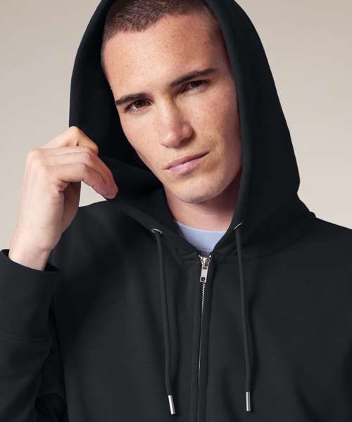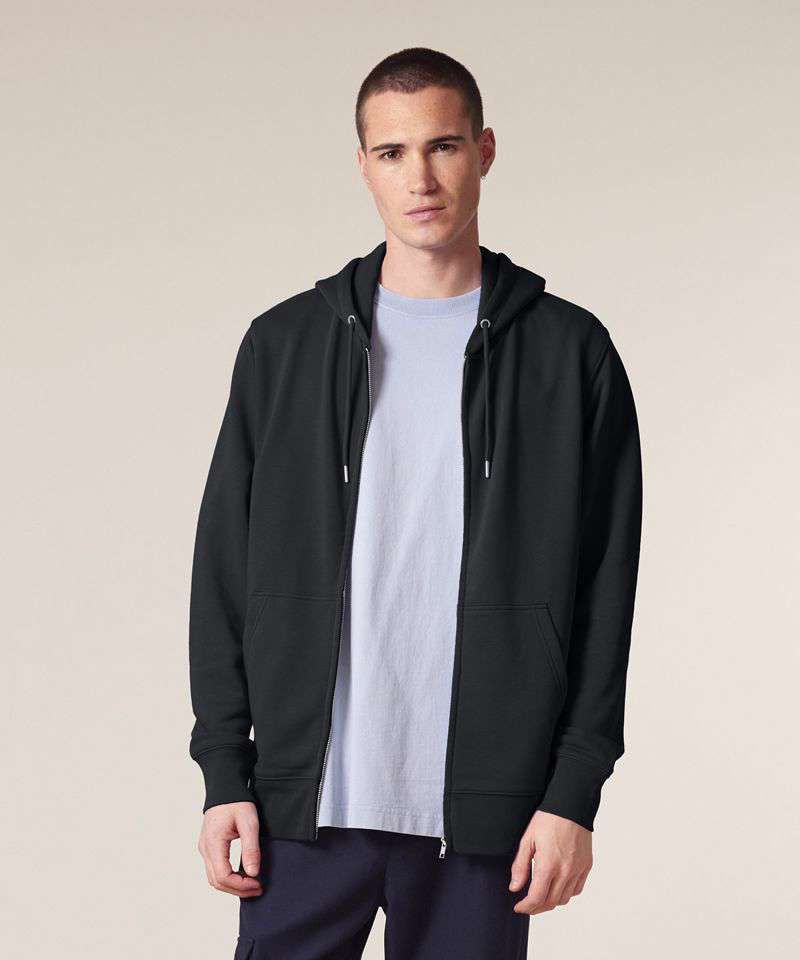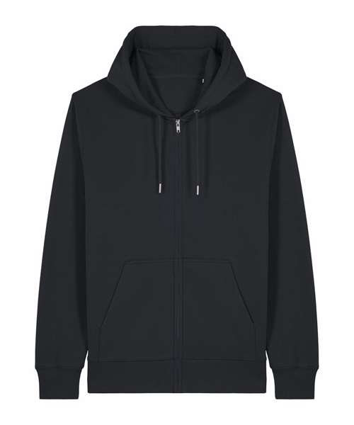Premium, unisex, mid-light, zip-through hoodie sweatshirt in 85% organic cotton and 15% recycled polyester. 300gsm French terry. Medium fit. Excellent printability.