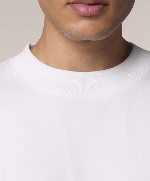 The unisex oversized Blaster 2.0 high neck t-shirt. Set-in sleeves. Dropped shoulder. 1x1 rib mock neck collar. Inside back neck tape. Twin-needle topstitches at sleeves and hem.