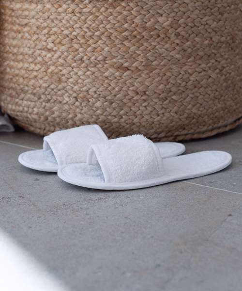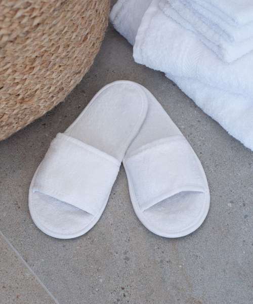 Step out in comfort with the classic open-toed mule slippers made from durable terry fabric.