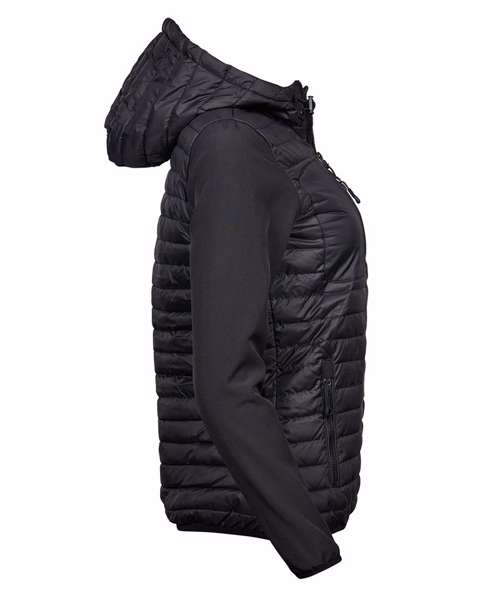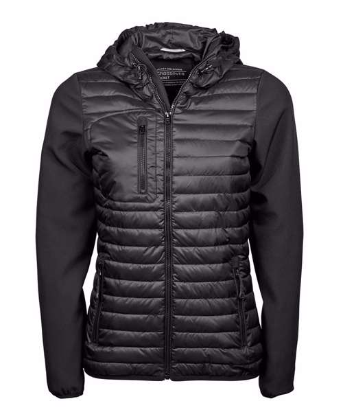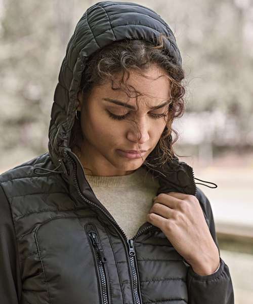 The cool Women’s hooded crossover jacket features stunning detailing such as a chest pocket with zip and an adjustable hood, making it both practical and fashionable. For a sporty look, it combines a light polyester 300T with padding and softshell. The jacket has an adjustable hem, elastic cuffs, two side pockets and an inner pocket.