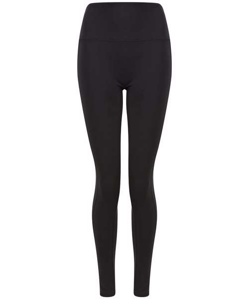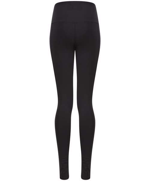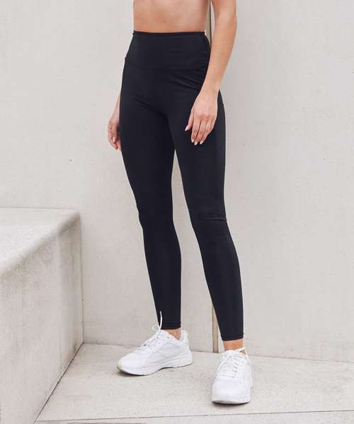 Women's core leggings with high waist and deep waistband. Phone pocket in side panel on left side. Tear-out label.