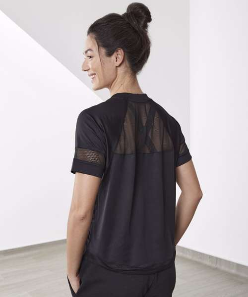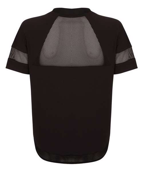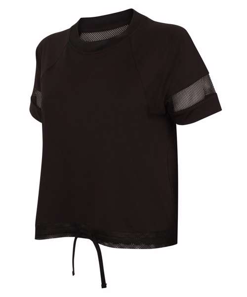 Oversize T, mesh back yoke and sleeve panels, draw cord hem with panel, lightweight soft hand feel fabric, tear-out label.