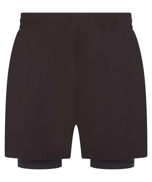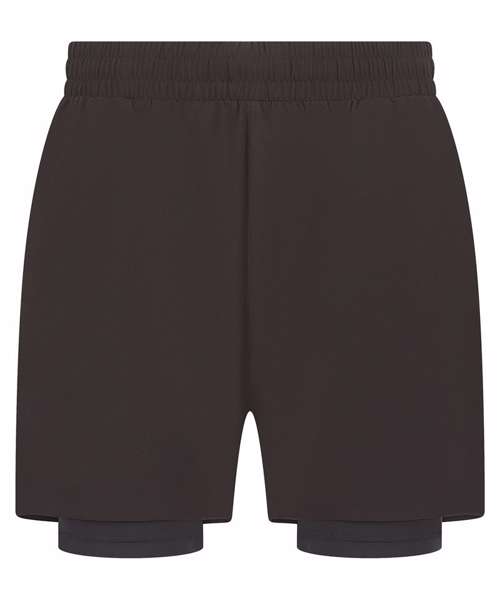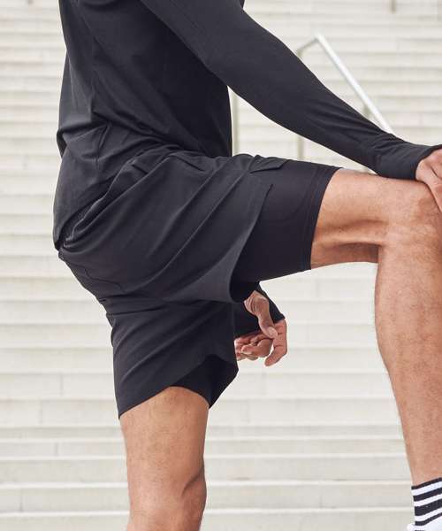 Men’s double-layer sports shorts with four-way stretch. Microfibre top short and polyester interlock under short. Side zipped welt pockets. Self-fabric elasticated waistband with inner drawcord. Side vents. Integrated under short. Phone pocket on under short, right-hand side when worn with media access. WIcking properties on under short. Tear-out label.