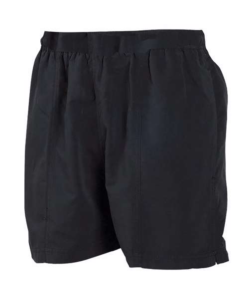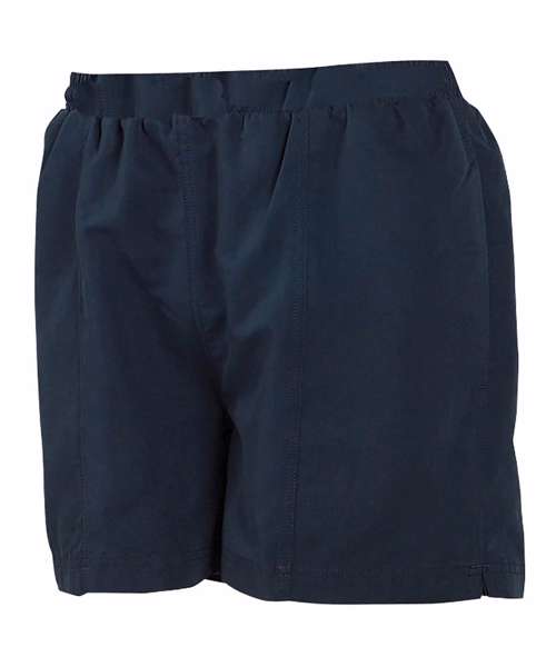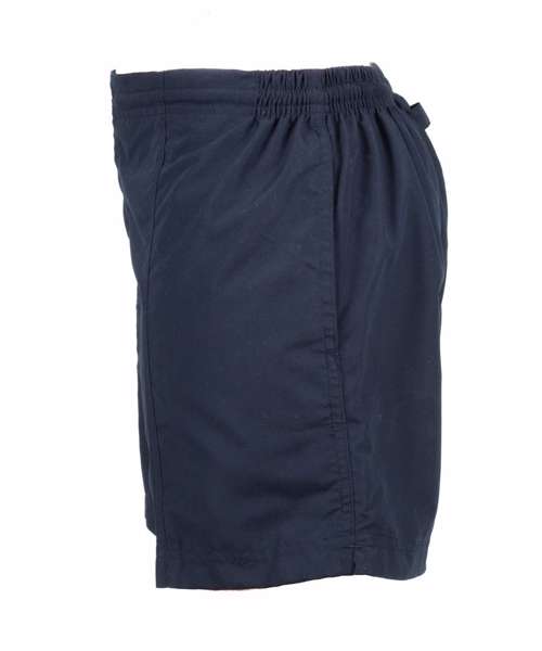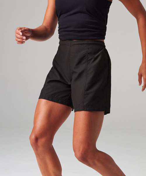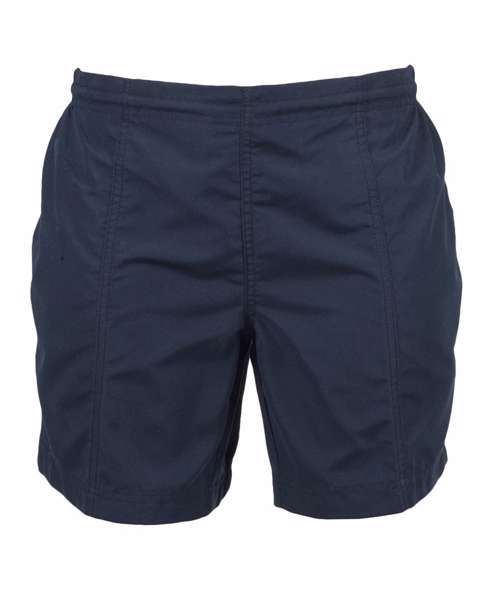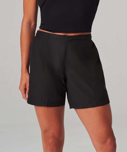 Waistband with flat front. Waistband elasticated at back and sides. 2 x side-seam pockets. Back pocket with key-cord. Twin needle seaming down centre front panels. Unlined.