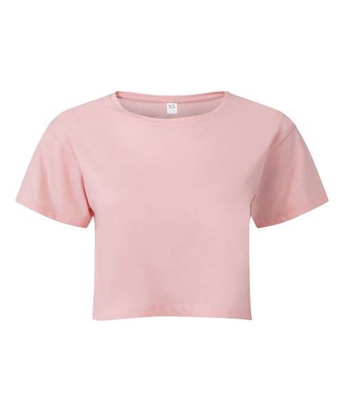 Cropped t-shirt. Short sleeve. Crew neck. Soft-feel. We recommend using block out vinyl and inks.Product contains no branded neck or waist label. Removable Kimble or looped garment tags. Inner seam label holds important product information on one label with a second label containing brand information which can be cut-away.