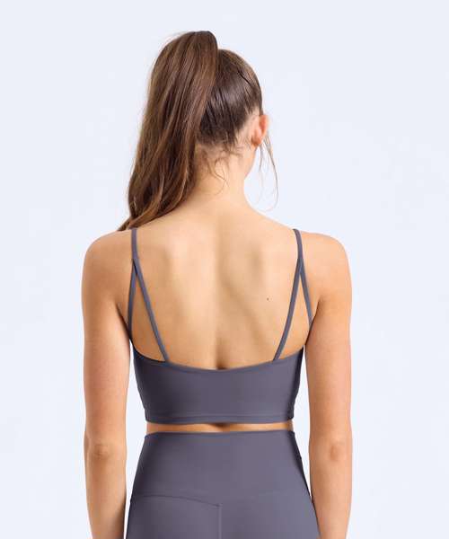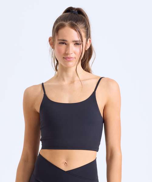 Certified recycled nylon. Stretch. Smooth finish. Medium impact. Hidden sports bra inner with removable bra pads for additional support. Double-layer back strap detail.