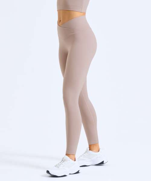 Certified recycled nylon. Stretch. Smooth finish. Cross front waistband. Full-length. Minimal seams.
