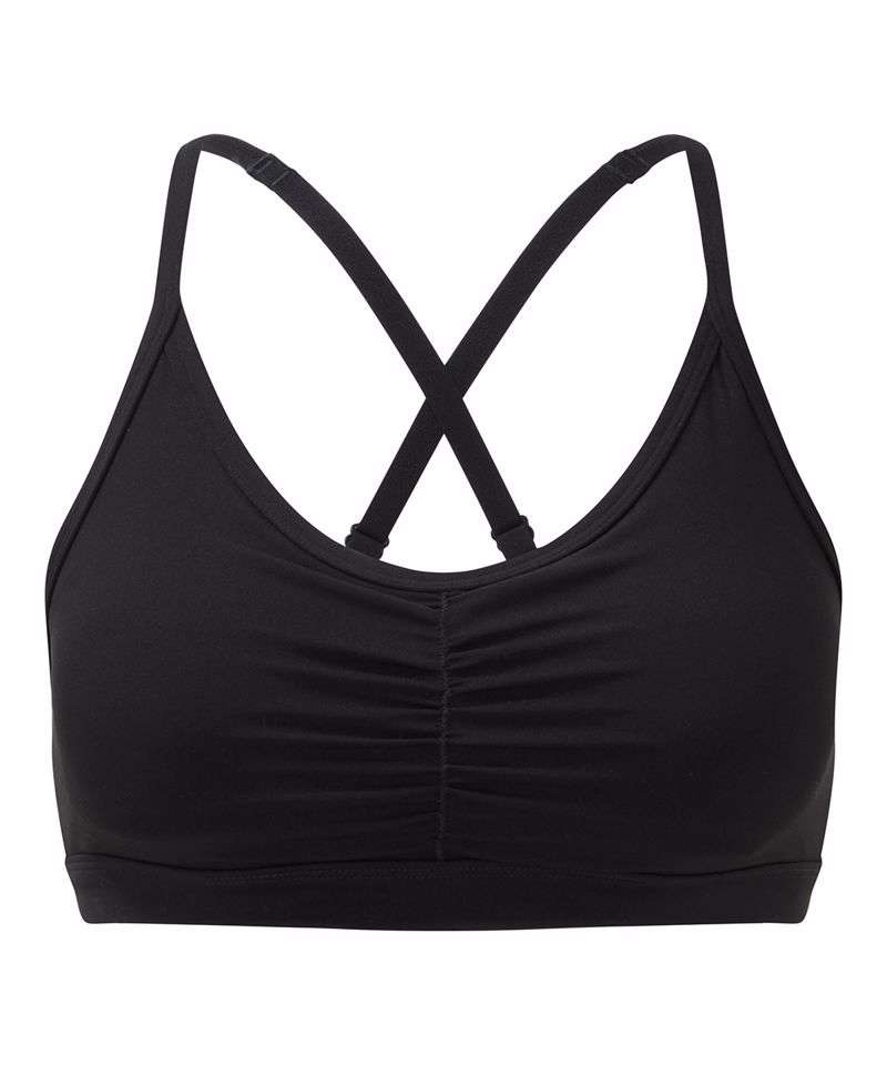 Medium-impact sports bra. Elasticated under bust for added support. Ruched detailing to centre front. Cross back straps with adjusters. Removable padding inner. Panel detailing to back with mesh detail centre. We recommend using block out vinyl and inks.Product contains no branded neck or waist label. Removable Kimble or looped garment tags. Inner seam label holds important product information on one label with a second label containing brand information which can be cut-away.