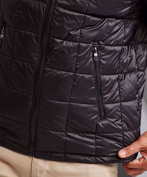 Tonal coil zip on centre front with signature zip puller and mouse tail piping on each side of zip opening. Box Square stitched baffle quilting on body and sleeves. 250gsm lightweight polyester fill. Fully-lined in tonal polyester. Tonal coil zipped pockets with double zip garages. Stretch binding on cuffs for added protection. Internal secure welt zipped pocket. Internal back neck hanger loop. Packable bag. Internal zipped opening on back panel for embroidery access. Product contains no branded neck label.* Removable Kimble or looped garment tags. Inner seam label holds important product information on one label with a second label containing brand information which can be cut-away.