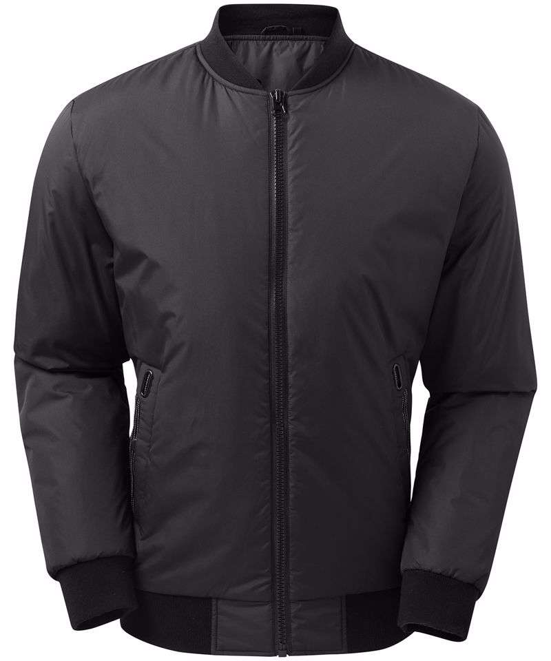 Tonal fashion coil zip on centre front with signature zip puller. Insulated body and sleeves. 100gsm lightweight polyester fill. Fully-lined in tonal polyester. Bomber style collar. Welt pockets with rubberised stud opening, striped grosgrain trim with rectangular eyelet. Tonal elasticated cuffs and hem. Internal double jet zipped pocket. Internal zipped opening for embroidery access. Product contains no branded neck label.* Removable Kimble or looped garment tags. Inner seam label holds important product information on one label with a second label containing brand information which can be cut-away.