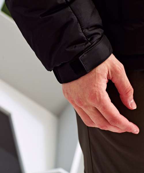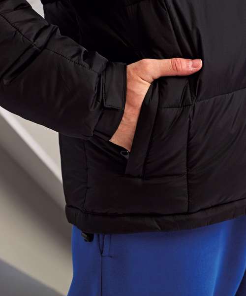 Padded jacket. Full-length zip with padded collar for warmth. Two zipped side pockets. Sleeves have adjustable hook and loop cuffs. Hemline has two adjustable cord toggles. One inner pocket and embroidery access to left chest. Showerproof. Product contains no branded neck label. Removable Kimble or looped garment tags. Inner seam label holds important product information on one label, with a second label containing brand information which can be cut away.
