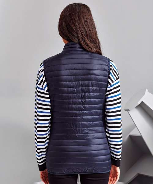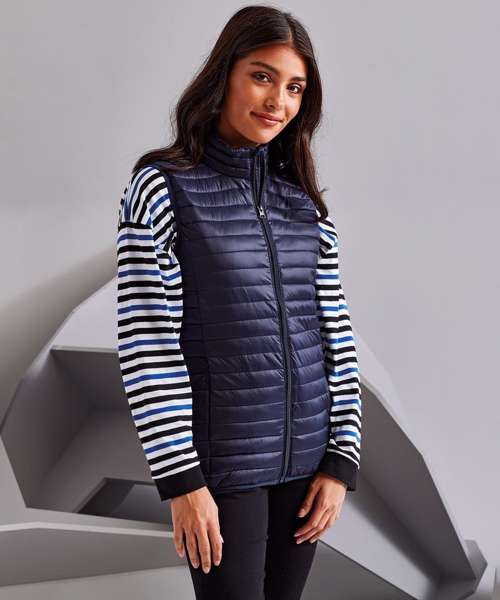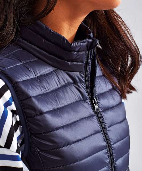 Tonal coil zip on centre front with signature zip puller and internal storm flap and chin guard. Horizontal stitched sandwiched narrow baffles. 250gsm lightweight polyester fill. Internal binding on all seams. Internal back neck hanger loop. Concealed zipped pockets with teardrop pullers. Stretch binding around armholes and hem for added protection. Packable bag. Product contains no branded neck label.* Removable Kimble or looped garment tags. Inner seam label holds important product information on one label with a second label containing brand information which can be cut-away.
