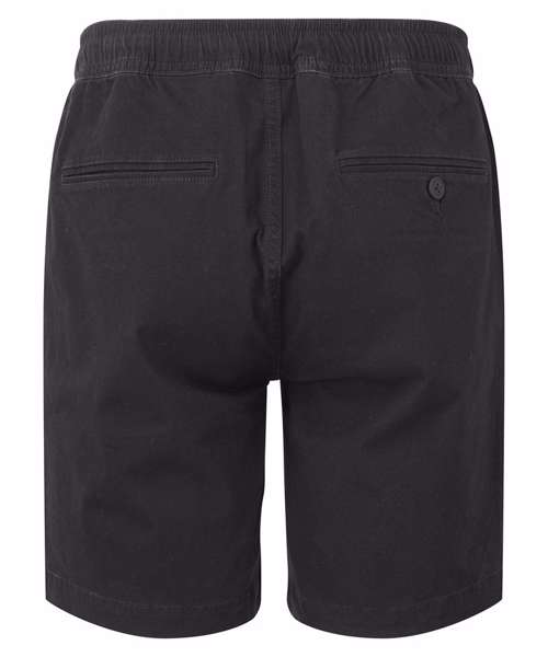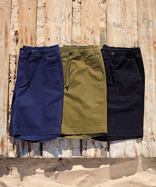 Two swing pockets and two back jet pockets with button fastening to one. Coin pocket. Elasticated waistband with drawstrings. Gunmetal eyelets and caps to drawstrings. Zip fly and button fastening to the front. Soft finish fabric. Shorts can be worn rolled up.