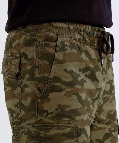 Two swings pockets with coin pocket and two back bellowed pockets with hook and loop fastening. Bellowed pockets to either leg with hook and loop fastening. Elasticated waistband with drawstrings. Gunmetal eyelets and drawstring ends. Fly stitched detailing. Soft finish fabric.