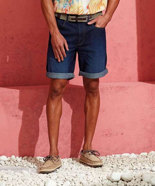 What's better than a classic denim short? The fit of these men’s denim shorts is easier on the thigh, so you can easily style them rolled up at the hems. Washed for an authentic finish, they feature brass details with contrast stitching.